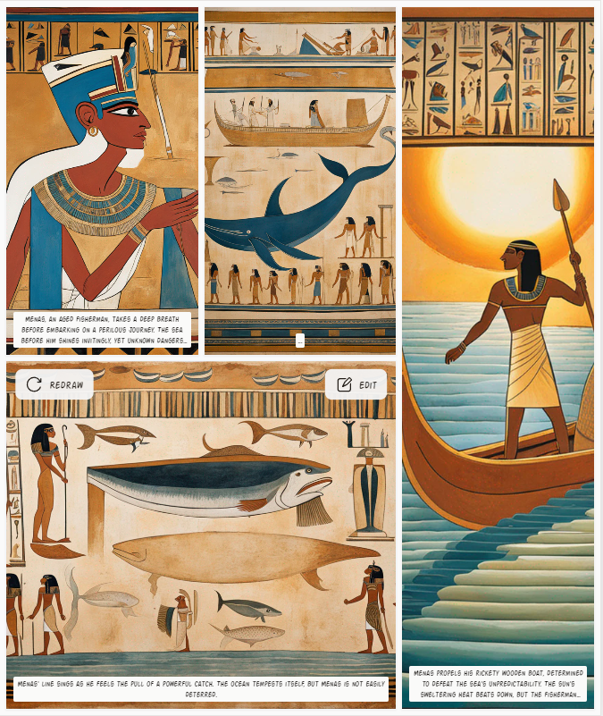 Le style de bande dessinée égyptienne s’inspire de l’art et de la culture de l’Égypte antique. Il se caractérise souvent par des personnages dessinés de profil, des hiéroglyphes, des formes simples aux lignes droites et épurées, et une utilisation marquée de la couleur.